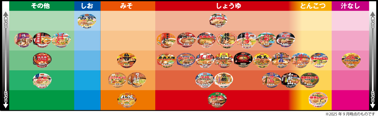 例えば、醤油味では、シンプルな「あっさり醤油」から背脂がきいた「こってり醤油」まで。豚骨醤油味では、豚骨が強めの商品もあれば醤油が強めの商品も…!こんなにたくさんの種類があると、どの商品を食べてみようか選ぶのに迷ってしまいますよね。そんなときに是非ご覧いただきたい、『凄麺 味の早見表』をご用意しました!