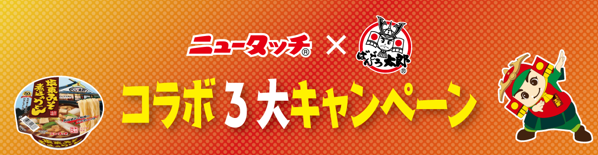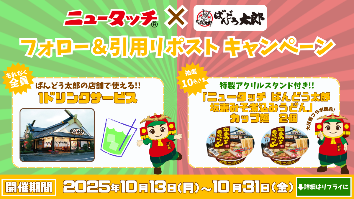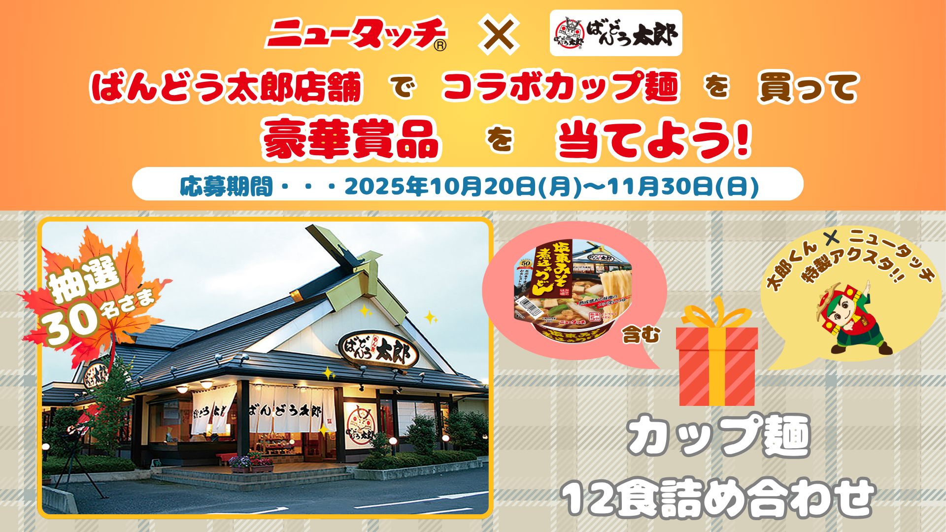 2025年10月20日、「ニュータッチ ばんどう太郎 坂東みそ煮込みうどん」が新発売(東北及び関信越エリア限定)。そこで、発売を記念し「ニュータッチ×ばんどう太郎 コラボ3大キャンペーン」を実施します!ばんどう太郎店舗でのお得なサービスや、コラボキャンペーン特製アイテムゲットのチャンスも。ぜひご参加ください。