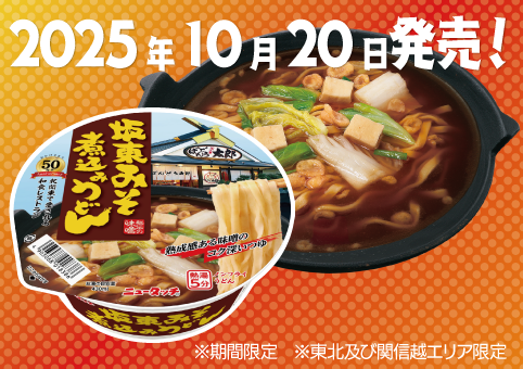 茨城県を中心に愛されている和食レストラン「ばんどう太郎」にて年間200万食以上も食べられている一番人気メニュー「坂東みそ煮込みうどん」を再現したノンフライカップ麺です。2025年10月20日より販売エリア(東北及び関信越)・期間限定にて新発売いたします(ヤマダイ公式通販では、全国にお届け可能)。