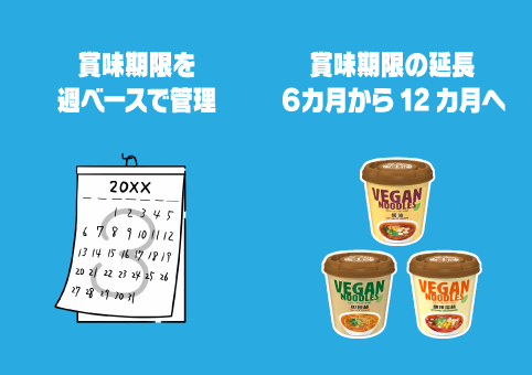 また、一般的には賞味期限6カ月のカップ麺業界において、独自に保存試験・検証を行うことで「ニュータッチ ヴィーガンヌードル」では12カ月の賞味期限を実現しています。これにより、長く商品をお楽しみいただけるようになり、フードロスの削減に貢献しています。